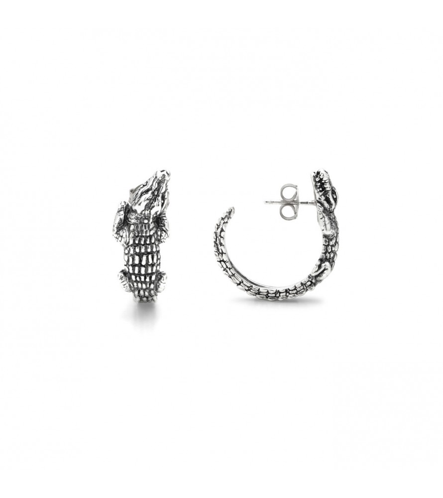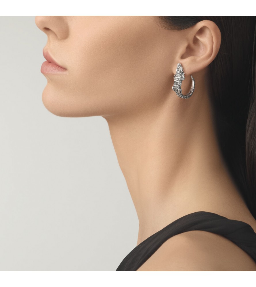 Vere e proprie sculture in miniatura, questi orecchini in argento brunito mostrano un coccodrillo che col corpo crea un elegante cerchio, mentre la testa dell'animale poggia delicatamente sul lobo dell'orecchio. Fatti a mano in azienda.
