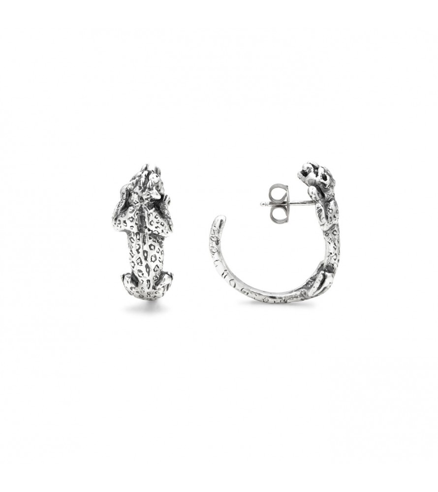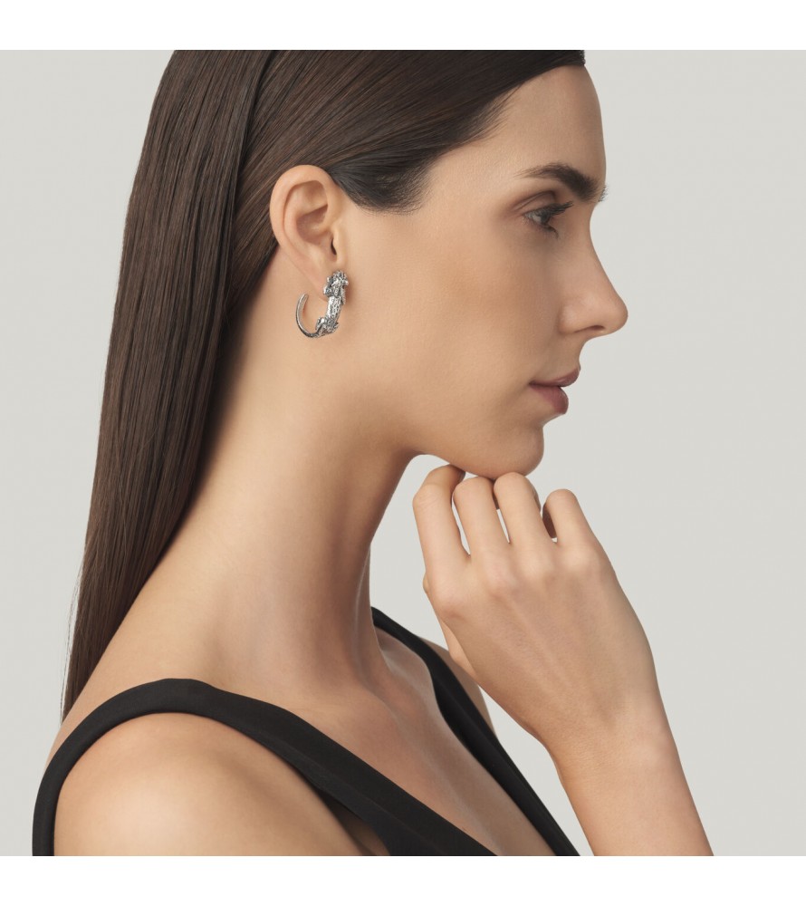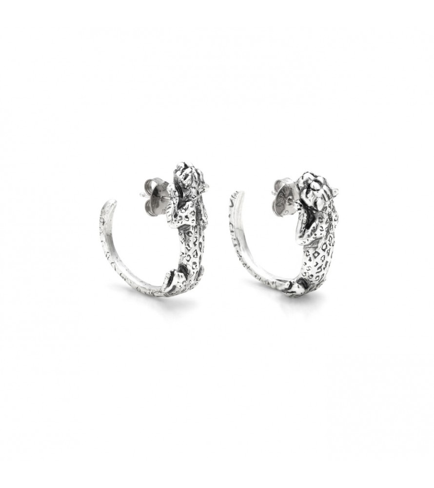 Eleganti sculture in miniatura, questi orecchini in argento brunito mostrano un leopardo che col corpo crea un elegante cerchio, mentre la testa dell'animale poggia delicatamente sull'orecchio. Un gioiello che unisce la forza e la bellezza delle collezioni Animalier, creando un accessorio sofisticato e unico. Realizzati a mano in azienda.