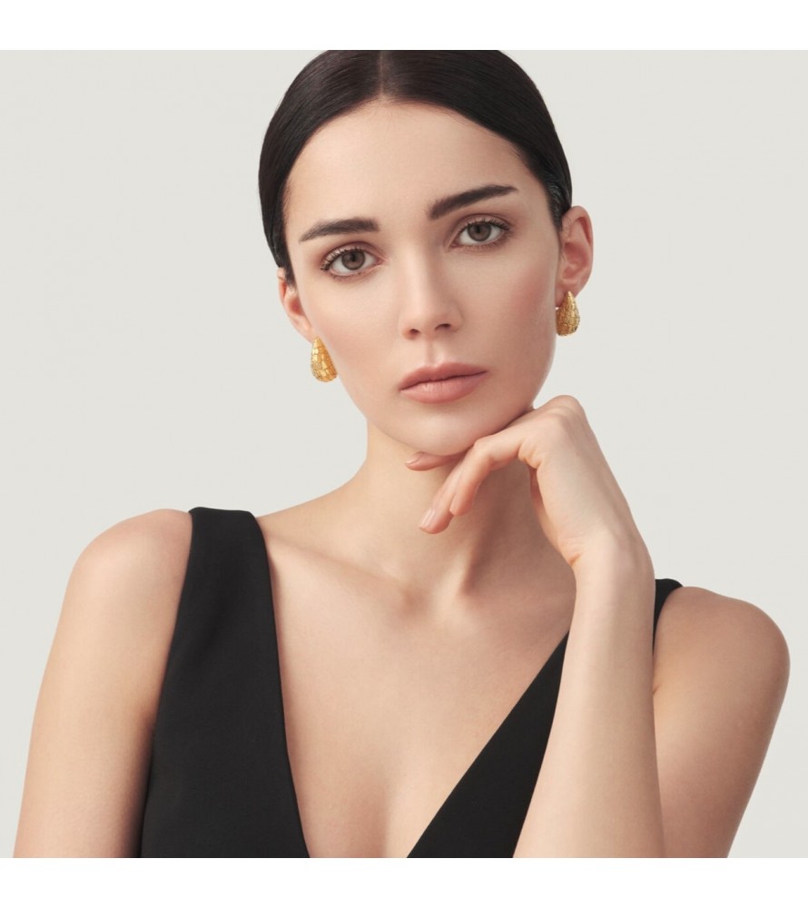 In questi orecchini d'argento dorato, di grande eleganza e leggerezza,Giovanni Raspini esplora il tema della goccia, decorata con la texture di coccodrillo. Eleganti, versatili e glamour, sono realizzati completamente a mano in azienda ad Arezzo