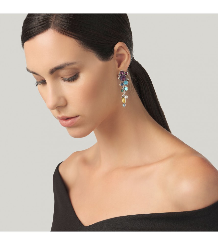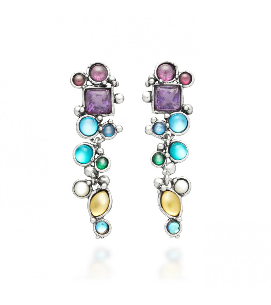 - I meravigliosi orecchini pendenti Cocktail, in edizione limitata, regalano un arcobaleno di colori. L'argento brunito, con un decoro naturalistico di sferette ramificate, dialoga con pietre naturali, gemme e perle naturali di acqua dolce, creando un gioiello importante e luminosissimo. Una sinfonia cromatica che vede quarzi viola ametista in taglio carré, madreperle con quarzo giallo in taglio navette, siamiti e perle naturali d'acqua dolce, per culminare in basso con un quarzo Mystic cabochon dalle sfumature iridescenti. Il gioiello è realizzato completamente a mano in home.Fatto a mano in Italia.