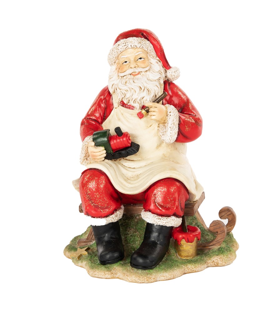 Babbo Natale seduto sullo slittino dipinge un trenino giocattolo.