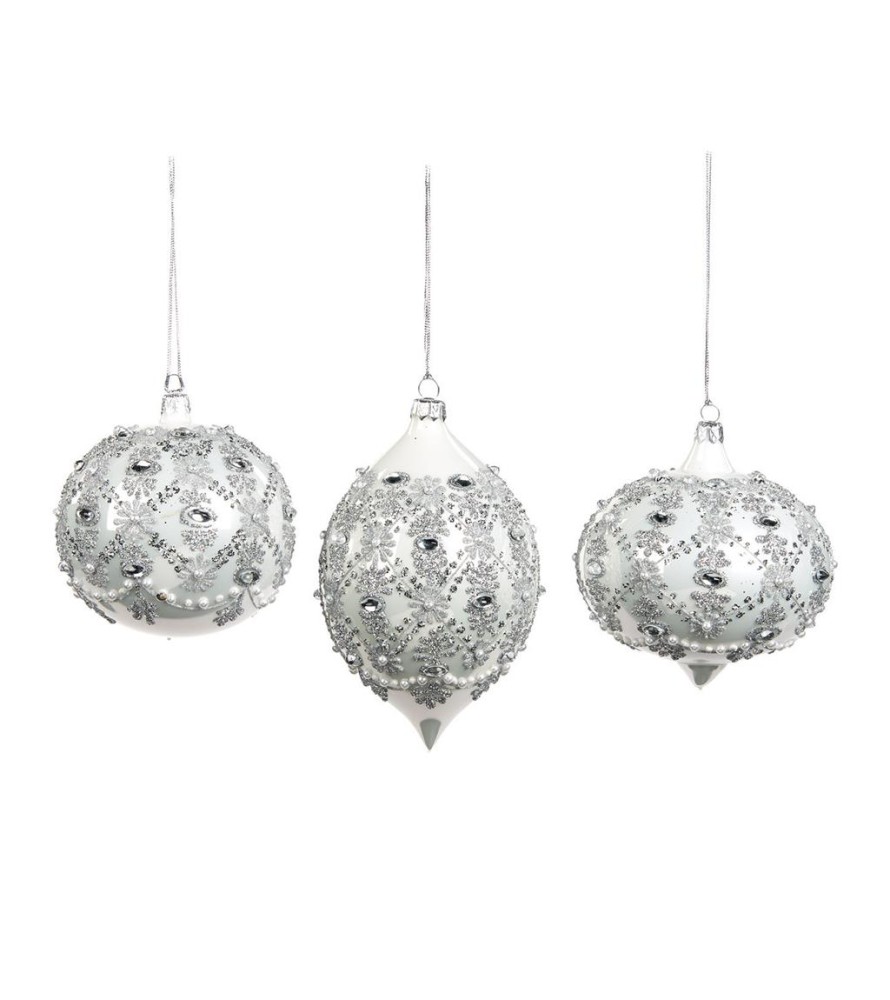 Elegante decoro in vetro soffiato decorato a mano e impreziosito con cristalli, perle e glitter. Ogni pallina è racchiusa in una scatola regalo.