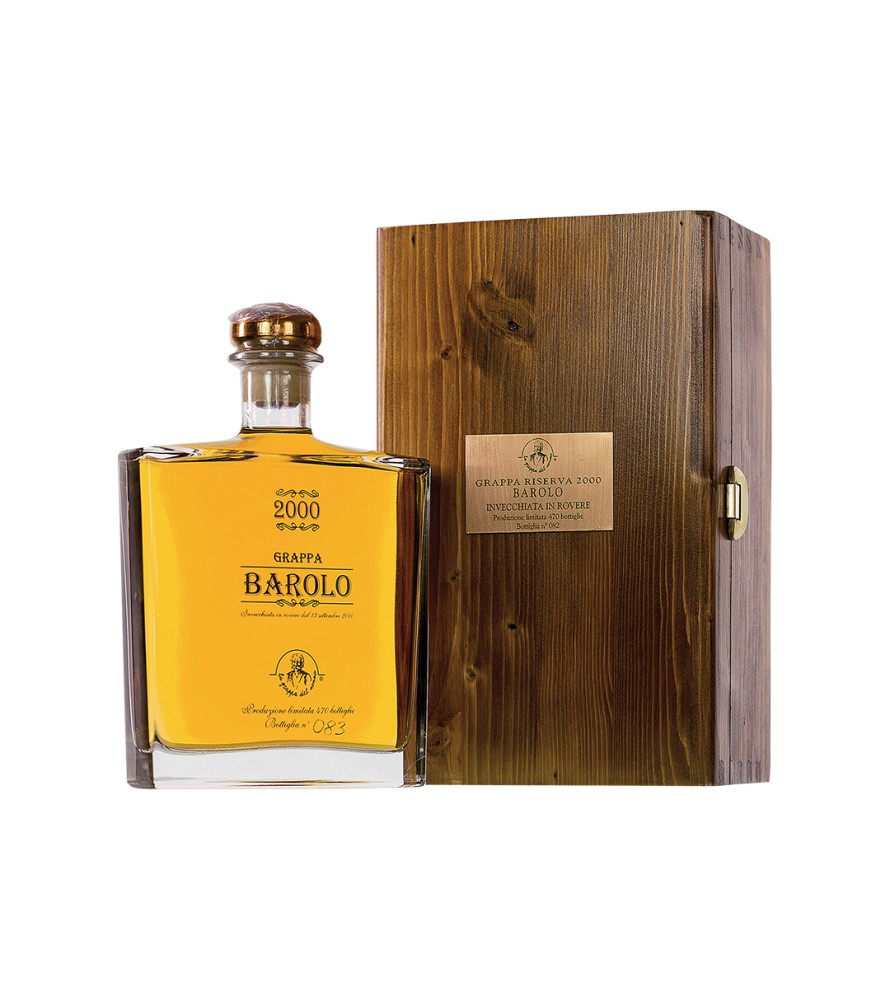 Grappa di Barolo distillata nel 2004 e invecchiata in botti di rovere confezionata in cassetta di legno con targa in rame. Produzione Limitata di 320 bottiglie numerate.