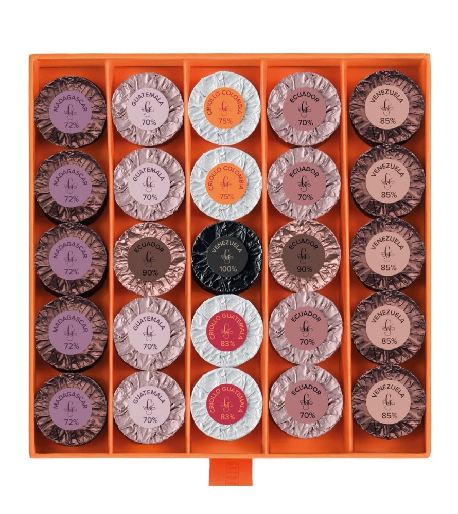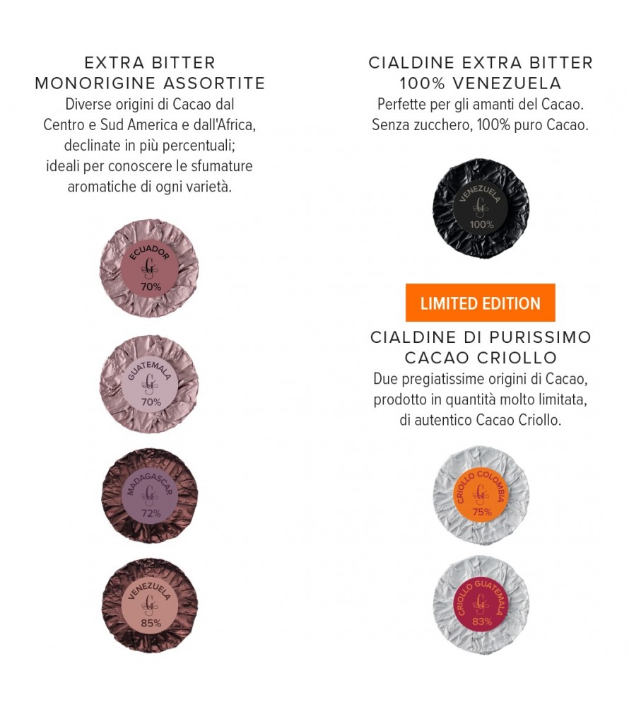 Nuove pregiate varietà di cacao si affiancano alle più apprezzate del passato per un vero e proprio viaggio intorno al mondo alla scoperta delle origini di questa materia prima: Ecuador 70%, Guatemala 70%, Madagascar 72%, Venezuela 85%, Ecuador 90%, Venezuela 100%, Criollo Colombia 75%, Criollo Guatemala 83%.