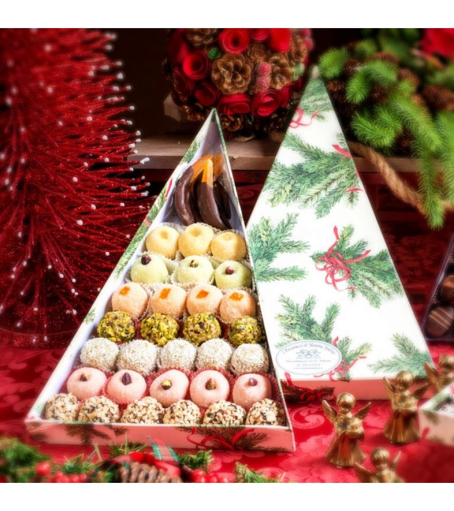 Peccatucci e Agrumelli(morbide praline di pasta di mandorle) e Scorzette di arance siciliane ricoperte di cioccolato fondente .Confezionati in elegante scatola a forma di albero di Natale realizzata a mano.