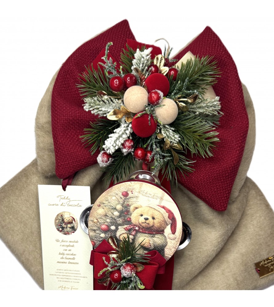 Al centro della composizione, incorniciato da nastri e decori, spicca un tamburello natalizio con l'immagine dell'adorabile Orsetto Teddy vestito per il Natale. Questo dettaglio centrale conferisce al fiocco un'espressione tenera e gioiosa, tipica della collezione "Cuore di Coccole".