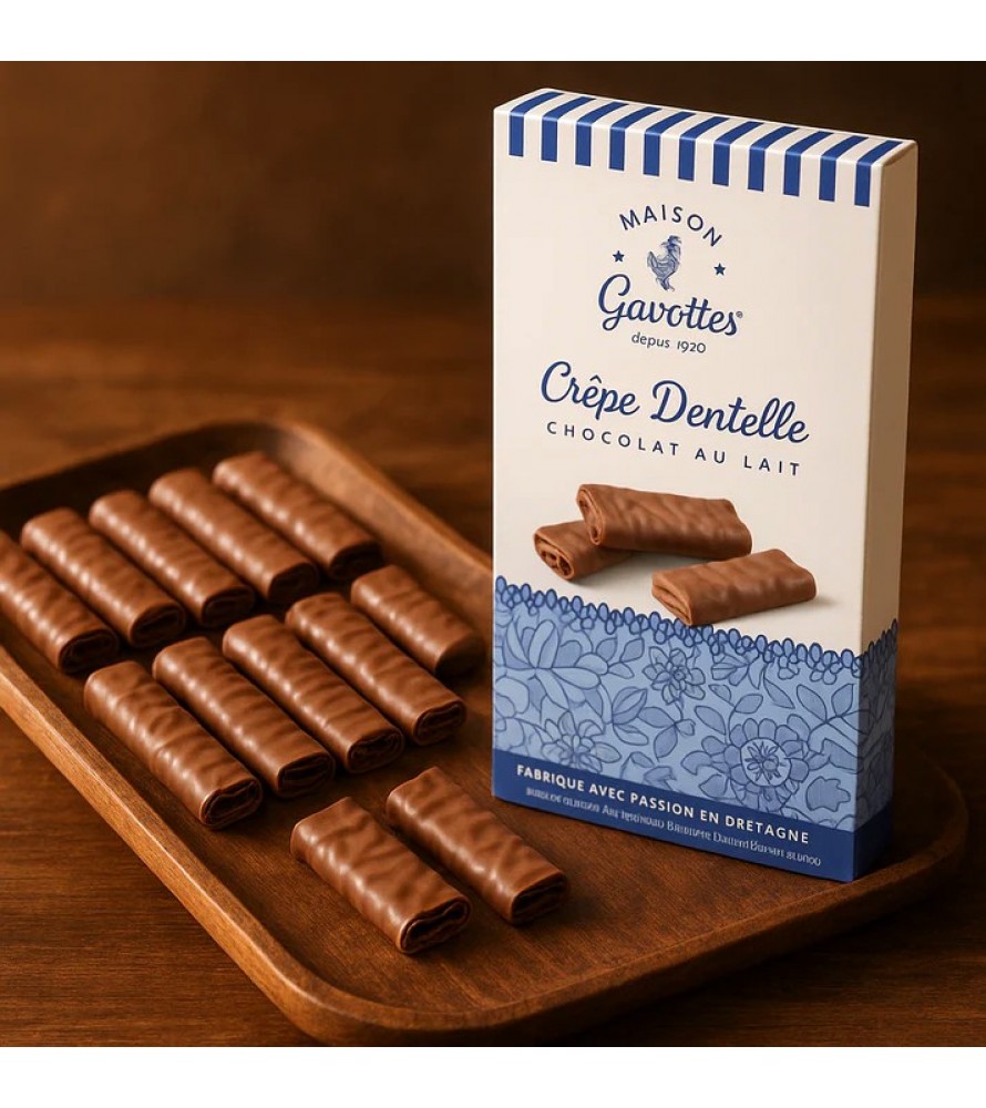 Scopri il gusto delicato e la consistenza inconfondibile delle Crêpe Dentelle Maison Gavottes, un’icona della pasticceria francese dal 1920 arricchite con Cioccolato fondente.