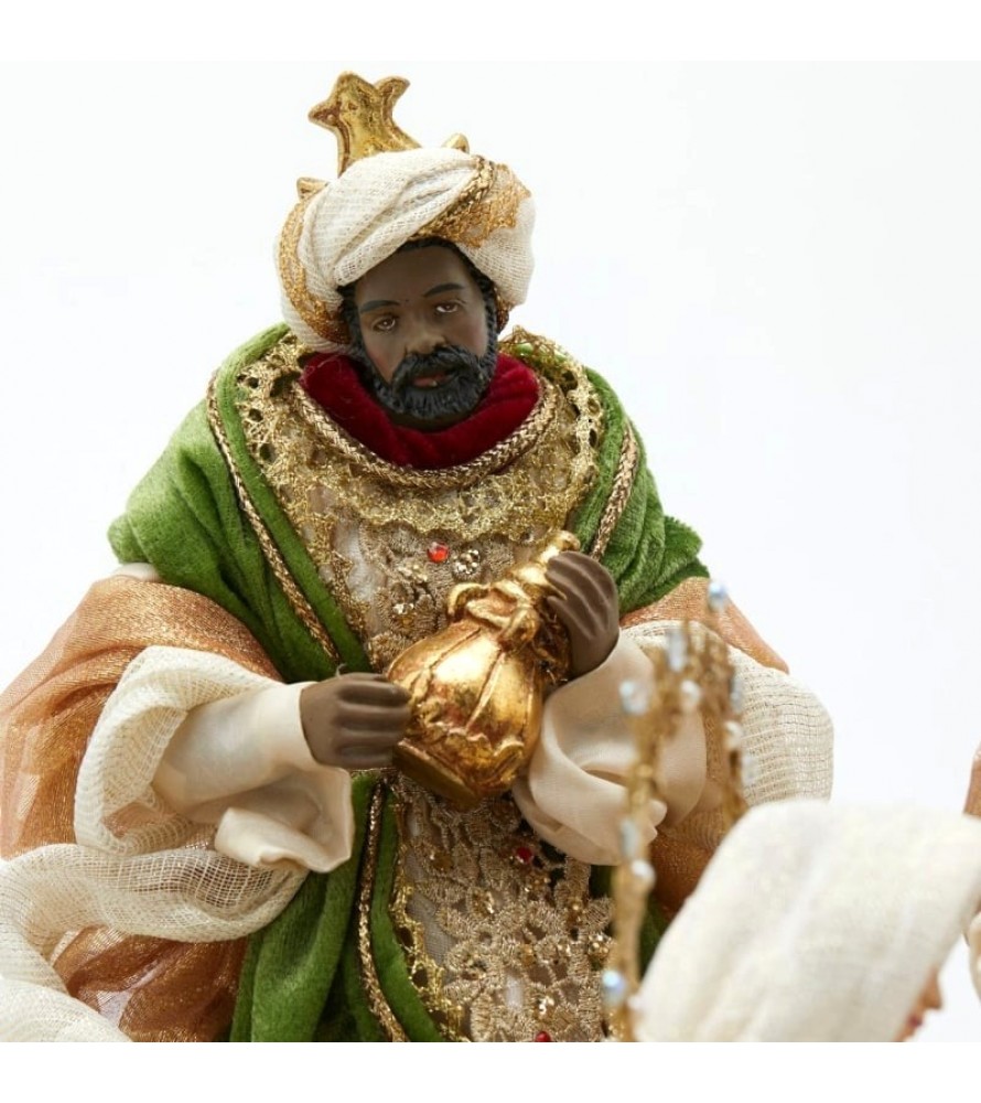 La nuova Natività King con Re magi di Edg è realizzata in resina e metallo finemente dipinta con colori tenui e impreziosita da raffinati e preziosi tessuti.