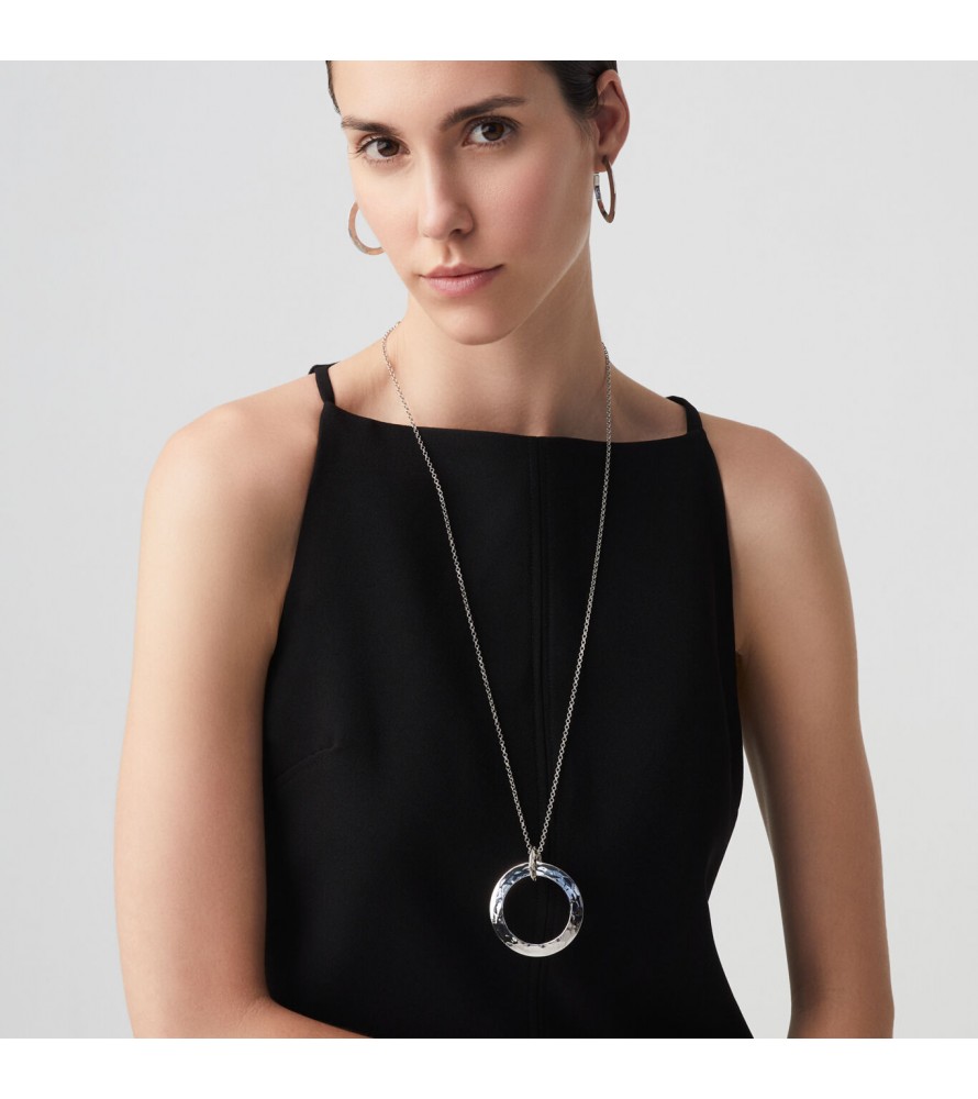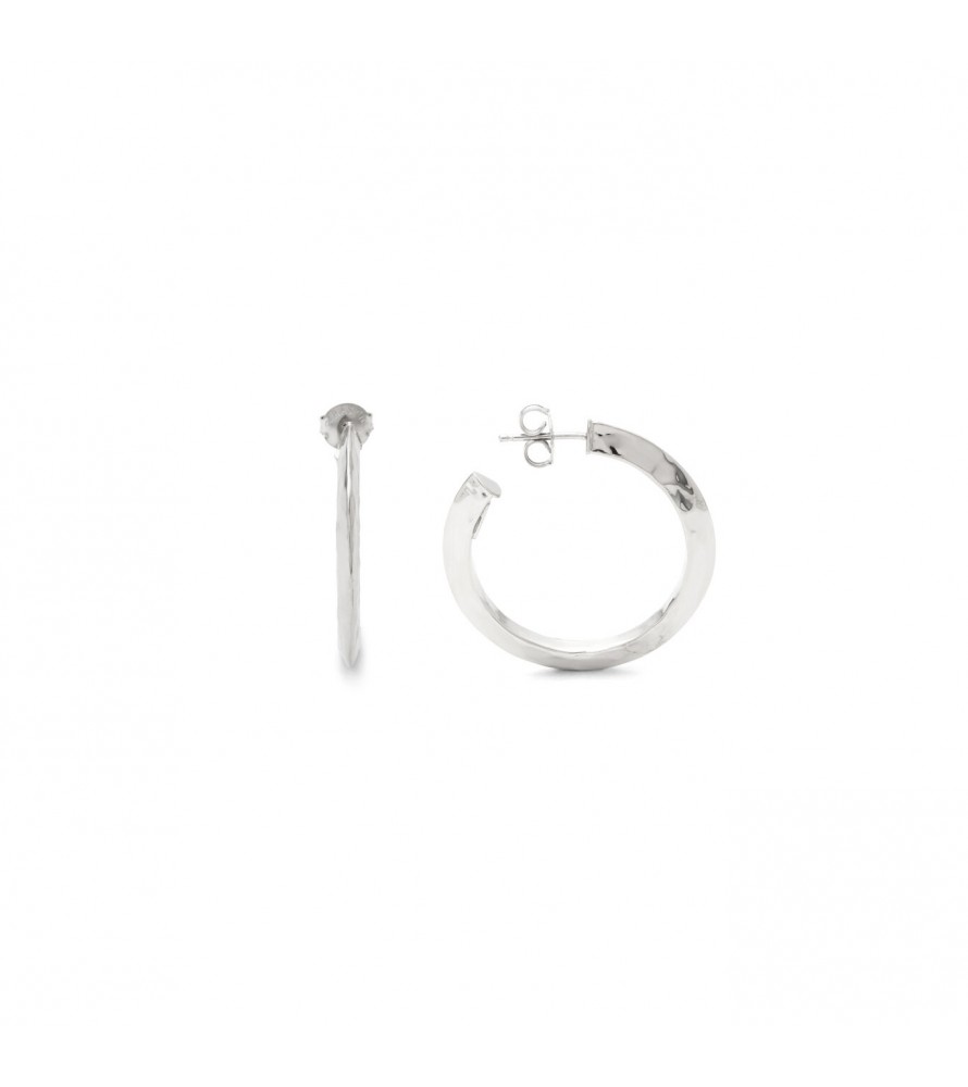 - Questi orecchini a cerchio, dalla sezione triangolare e con una texture che riflette una luce intensa, sono parte della collezione Blade. Ogni gioiello è progettato per un look deciso e rock, realizzato in azienda con una lastra d'argento martellata a mano.