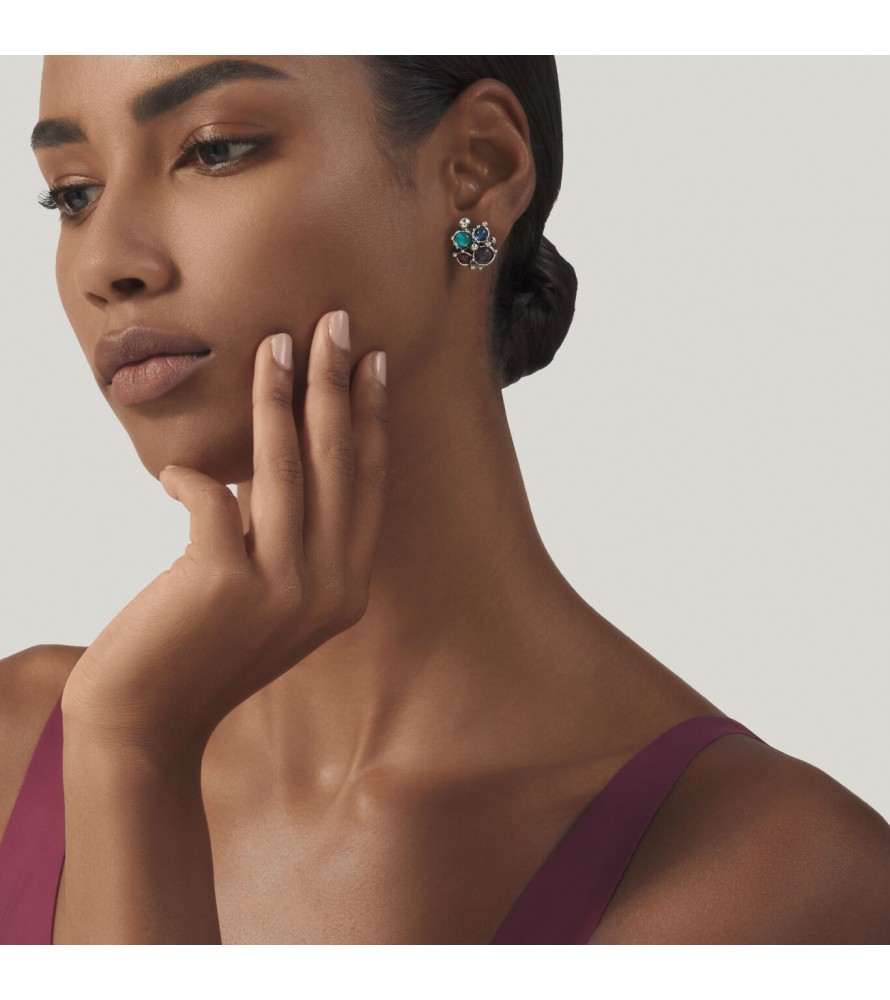 GLI ORECCHINI COCKTAIL GIOVANNI RASPINI sono creazioni policrome che si distinguono per luminosità e unicità. La struttura in argento brunito accoglie quattro gemme cabochon in delicate sfumature dal viola all’azzurro, creando un raffinato gioco di luce. Un design studiato per accompagnare i contorni del volto con naturale eleganza, specialmente se indossati con la siamite fucsia rivolta verso l’interno.