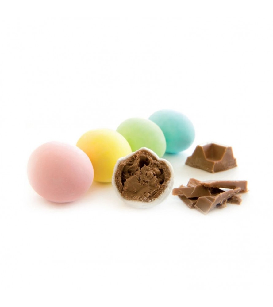 GLI OVETTI DI CIOCCOLATO CONFETTATI IN COLORI PASTELLO sono il dettaglio che rende magica la tavola pasquale. Ogni ovetto racchiude un guscio di finissimo cioccolato al latte che custodisce un cuore morbido e vellutato di crema alla nocciola. La finitura esterna, una confettatura sottile e croccante nei toni del rosa, azzurro, giallo e verde pastello, li rende tanto belli da vedere quanto irresistibili da gustare, portando un soffio di primavera in ogni assaggio.