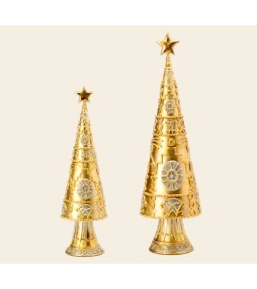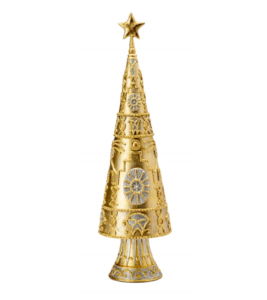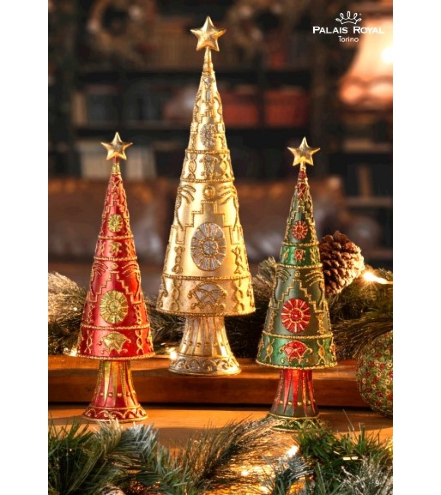 Decorazione da appoggio di Albero di Natale stilizzato realizzata in resina dipinta a mano e ricca di dettagli impreziositi con glitter.
