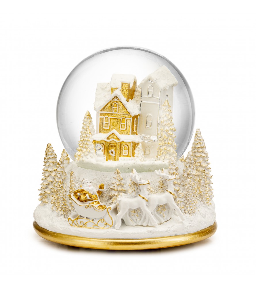 All'interno della sfera in vetro, si cela un incantevole villaggio invernale con case e un campanile finemente decorati in bianco e oro scintillante.La base in resina non è da meno. Rappresenta una suggestiva scena natalizia con Babbo Natale sulla sua slitta carica di doni, trainata da due maestose renne.