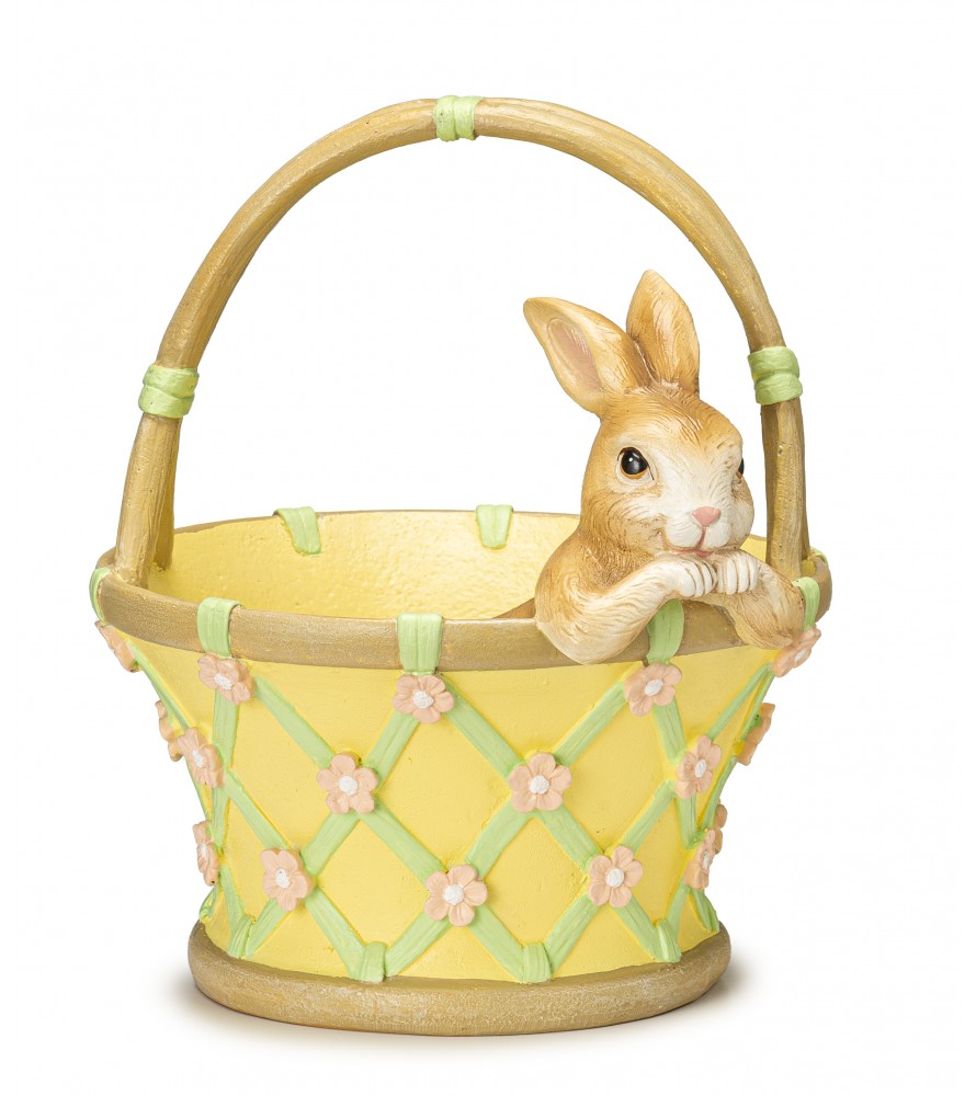 Cesto con coniglio realizzato in resina e dipinto a mano in colori brillanti. Confezionato in scatola regalo.Un simpatico e allegro oggetto decorativo e contenitivo che potrà avere mille utilizzi.