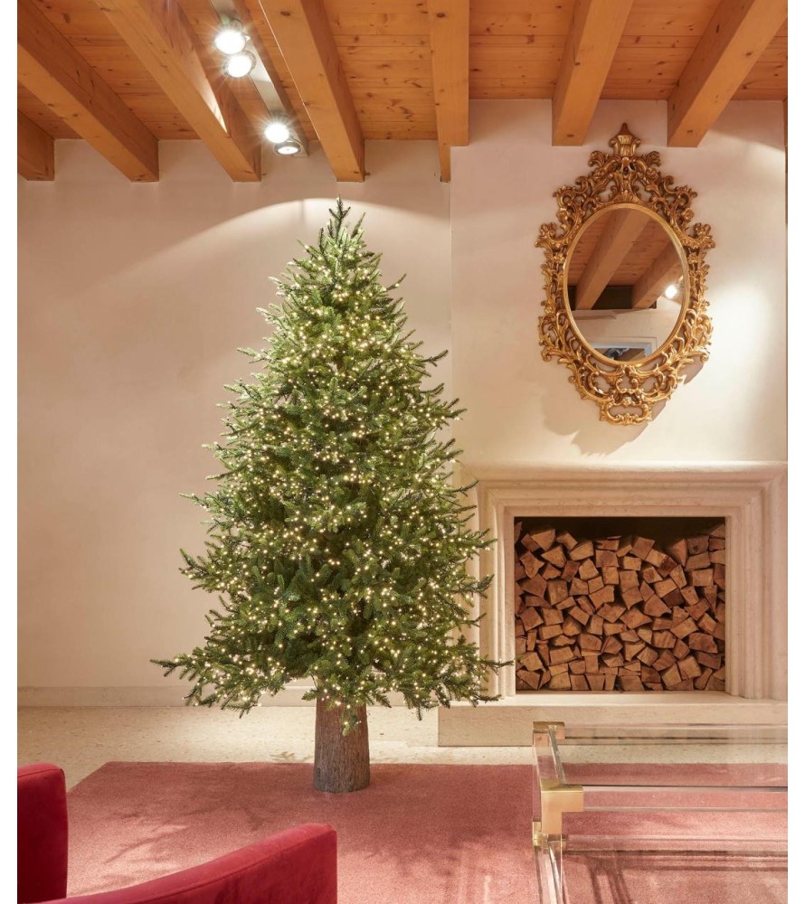 Albero di Natale Pino Luxury con 4000 Led a luce calda integrati nei rami, apertura ad ombrello con base in metallo.