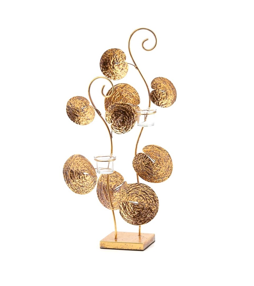 Bellissimo Portacandele in metallo dipinto a mano con motivo di foglie di Ninfea. Appoggiato sul mobile in salotto o in camera da letto creerà una zona elegante e suggestiva.