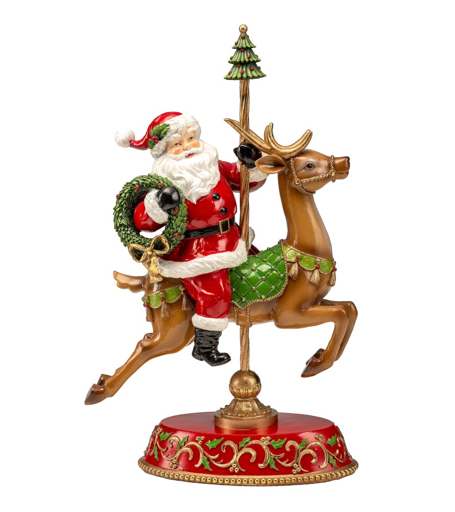 Bellissima Statua decorativa di Babbo Natale con Cervo finemente realizzata in resina e metallo dipinta a mano con colori lucidi e brillanti. Confezionata in scatola regalo.