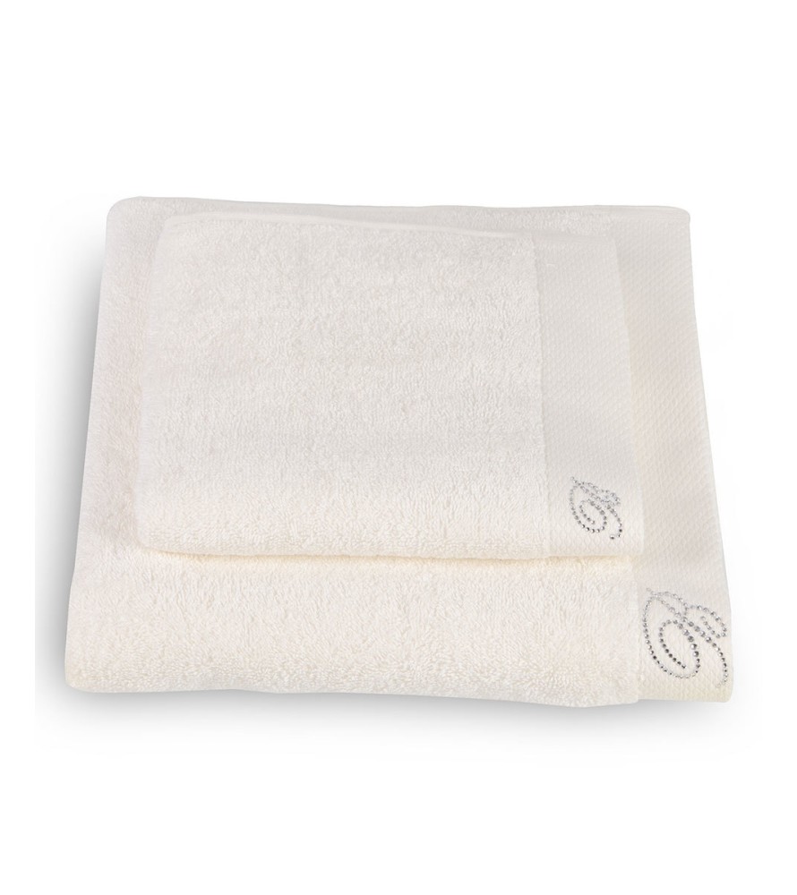 Coppia di salviette in morbida spugna di cotone idrofilo con monogramma Blumarine in strass Swarovski. Confezionato in Scatola