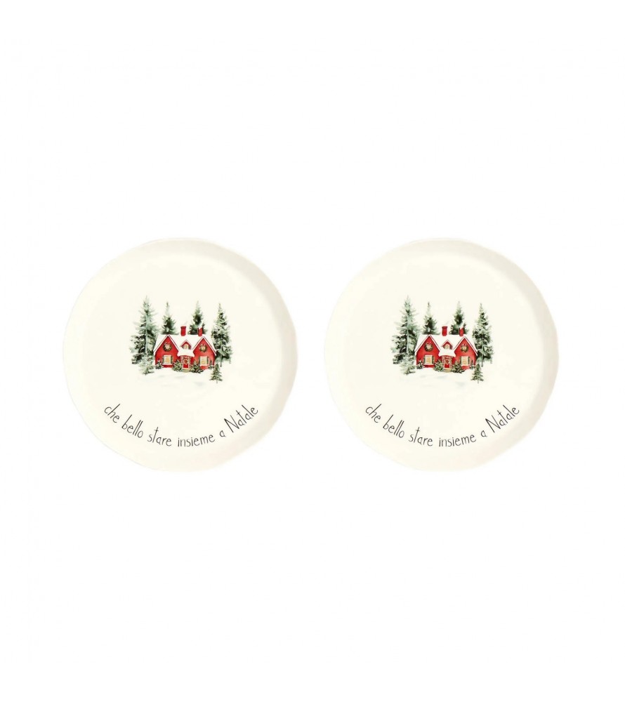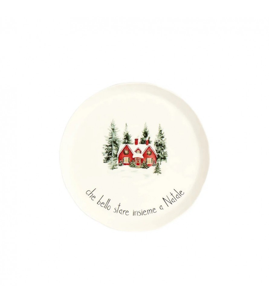 Ogni piatto è impreziosito da una tenera illustrazione di una casetta rossa innevata circondata da abeti, che evoca il calore e la serenità delle feste,la frase "che bello stare insieme a Natale" serigrafata lungo il bordo sottolinea il vero valore del periodo natalizio: la gioia della condivisione.