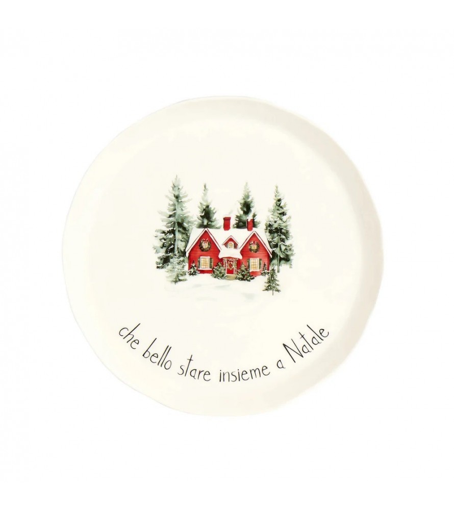 Il centro del piatto ospita una deliziosa illustrazione di una casetta rossa immersa in un paesaggio innevato di abeti, richiamando l'atmosfera delle fiabe nordiche.La frase "che bello stare insieme a Natale" serigrafata in nero lungo il bordo aggiunge un tocco di dolcezza e celebra l'importanza della famiglia e degli amici.