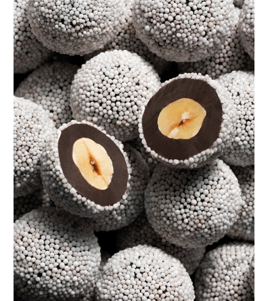 Il cioccolato pralinato vestito da caramella. Piccole delizie con un cuore di nocciola tostata, ricoperte da cioccolato fondente e da una granella di zucchero croccante.