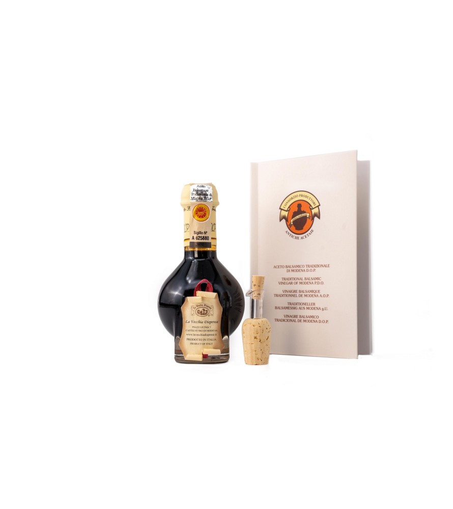 Aceto Balsamico Tradizionale di Modena DOP invecchiato per minimo 12 anni in batterie di legni pregiati secondo metodo tradizionale. L'astuccio include ricettario e tappo versatore.