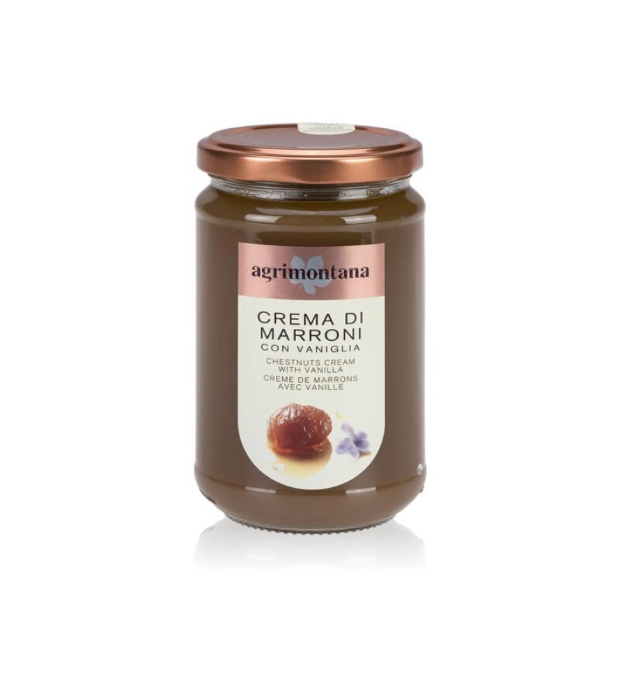 Agrimontana prepara la sua crema di marroni utilizzando i pezzi interi che accidentalmente si rompono in fase di pelatura. Questi grossi frammenti vengono cotti aggiungendo zucchero di canna ed estratto di bacche di vaniglia Bourbon fino ad ottenere una crema fine e delicata.