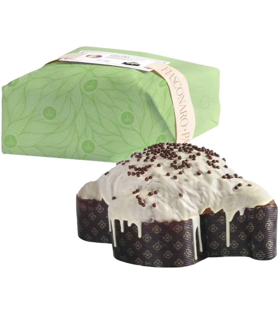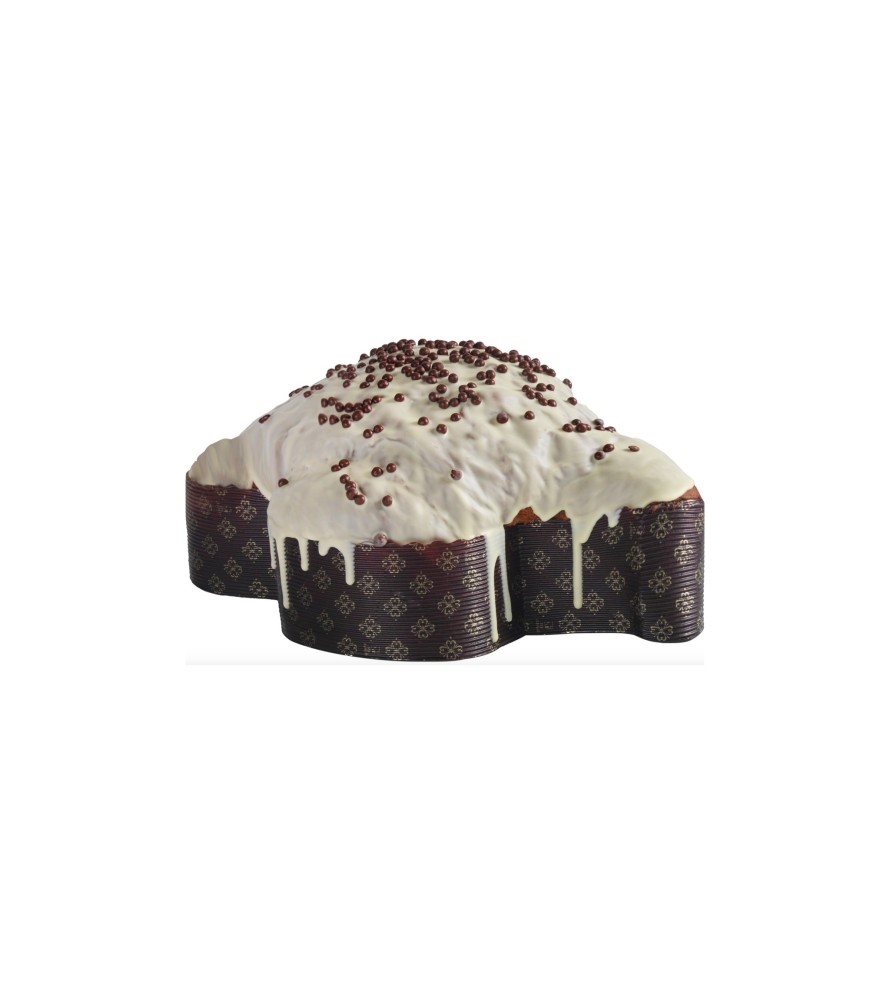 Colomba Artigianale da 1 kg lievitata 36 ore con gocce di Cioccolato e canditi di Pera William ricoperta di Cioccolato Bianco e Perle croccanti di Cioccolato, senza scorza di arance candita e mandorle. Incartata a mano.