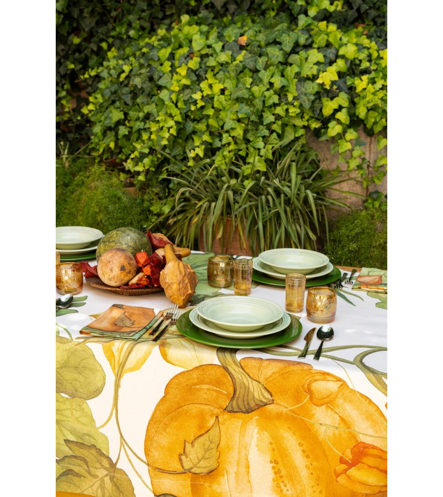 Nuova Tovaglia Potirons The Napking con stampa di zucche realizzata in 100% lino. Tutte le tovaglie di The Napkin sono confezionate in splendide scatole regalo serigrafate.