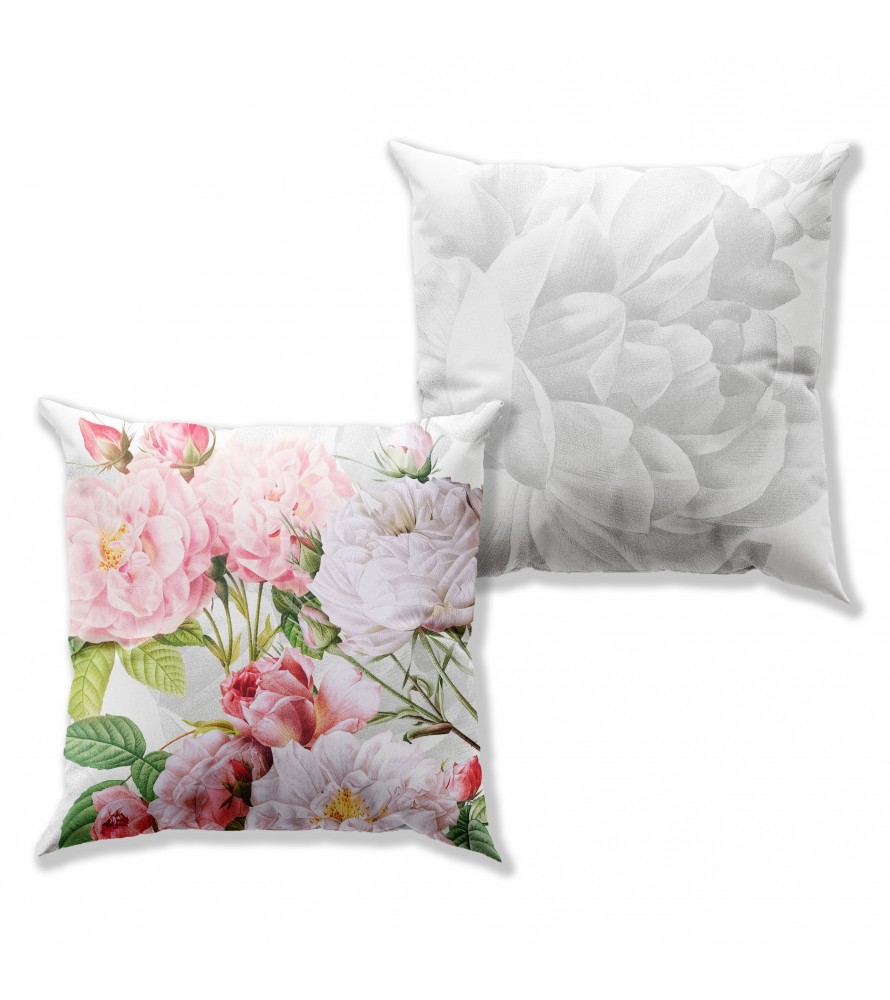 Cuscino lato frontale: presenta una vivace stampa floreale con rose in varie sfumature di rosa e bianco, accompagnate da foglie verdi. Il disegno è dettagliato e realistico, conferendo un tocco botanico raffinato e delicato all'ambiente.
