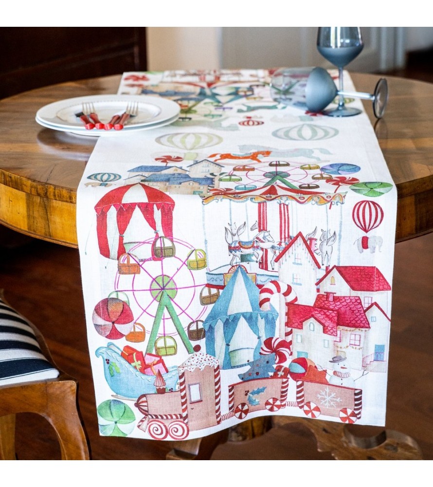 Bellissimo runner Circus The Napking con stampa a tema circo realizzato in 100% lino.