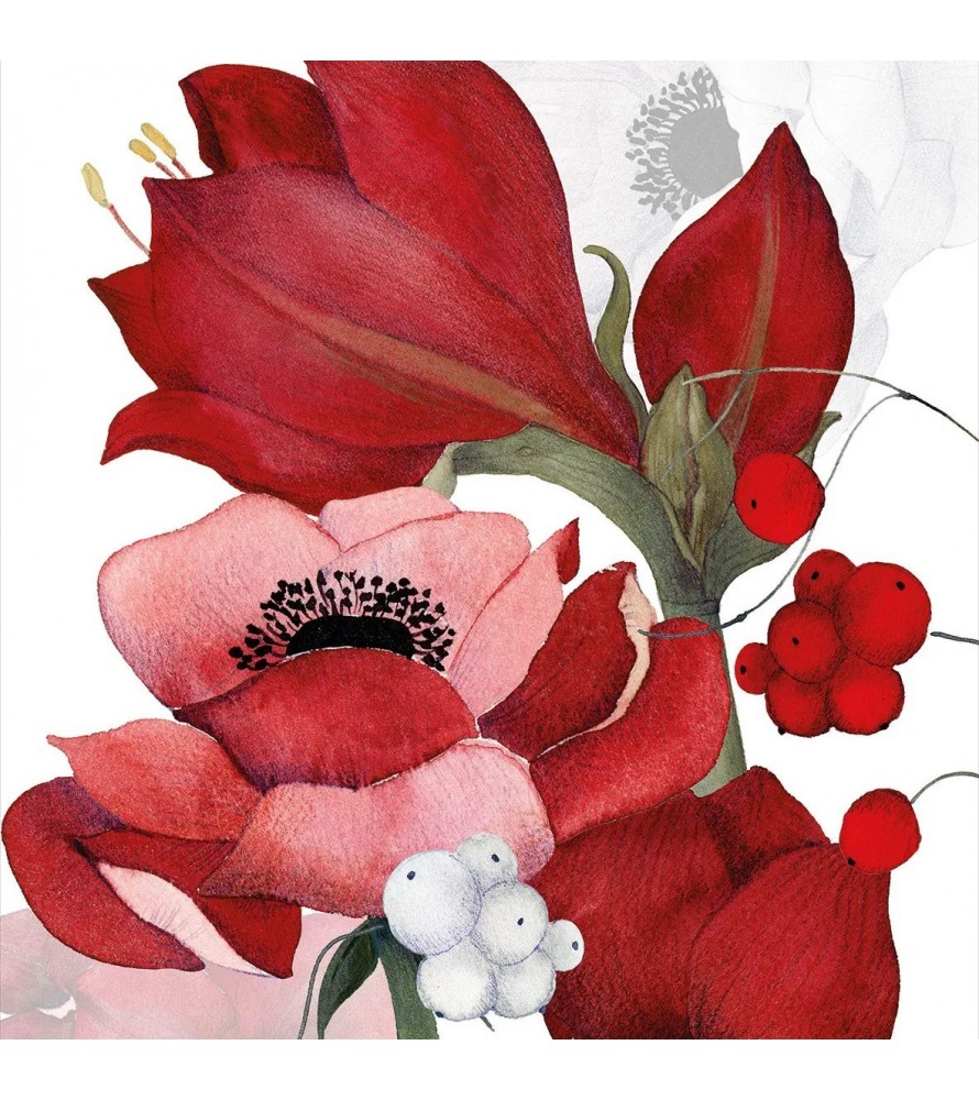 La vivace fantasia "Anemoni" trasforma questo canovaccio in un vero e proprio tocco d'arte per la tua cucina. Un'esplosione di fiori rossi intensi, bianchi candidi e delicate sfumature di rosa, arricchita da piccole bacche rosse e foglioline verdi, decora la superficie con un realismo sorprendente. Il disegno evoca la bellezza della natura e aggiunge un elemento decorativo unico all'ambiente.