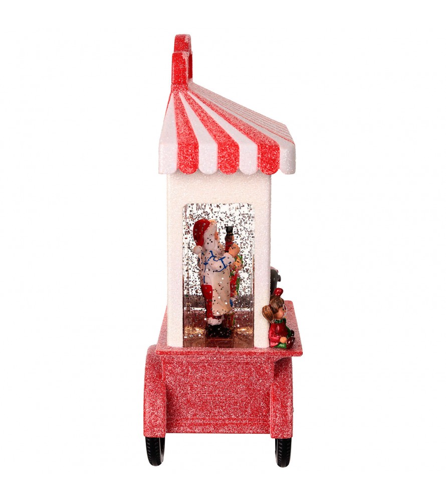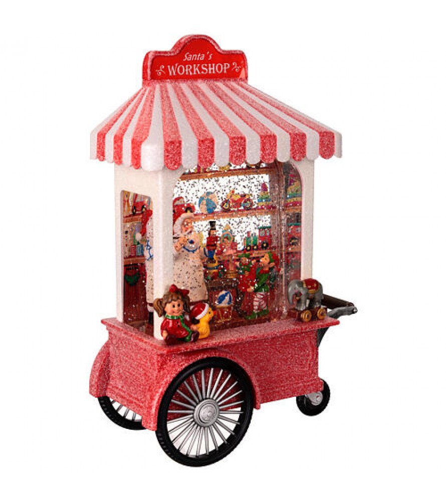 Bellissimo carretto lanterna con luce led e acqua con glitter in movimento automatico effetto neve,realizzato in poliresina. All'interno un indaffarato Babbo Natale sta ultimando la preparazione dei giocattoli per i più piccoli.