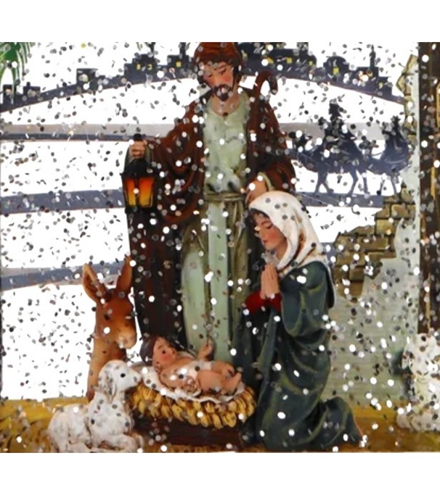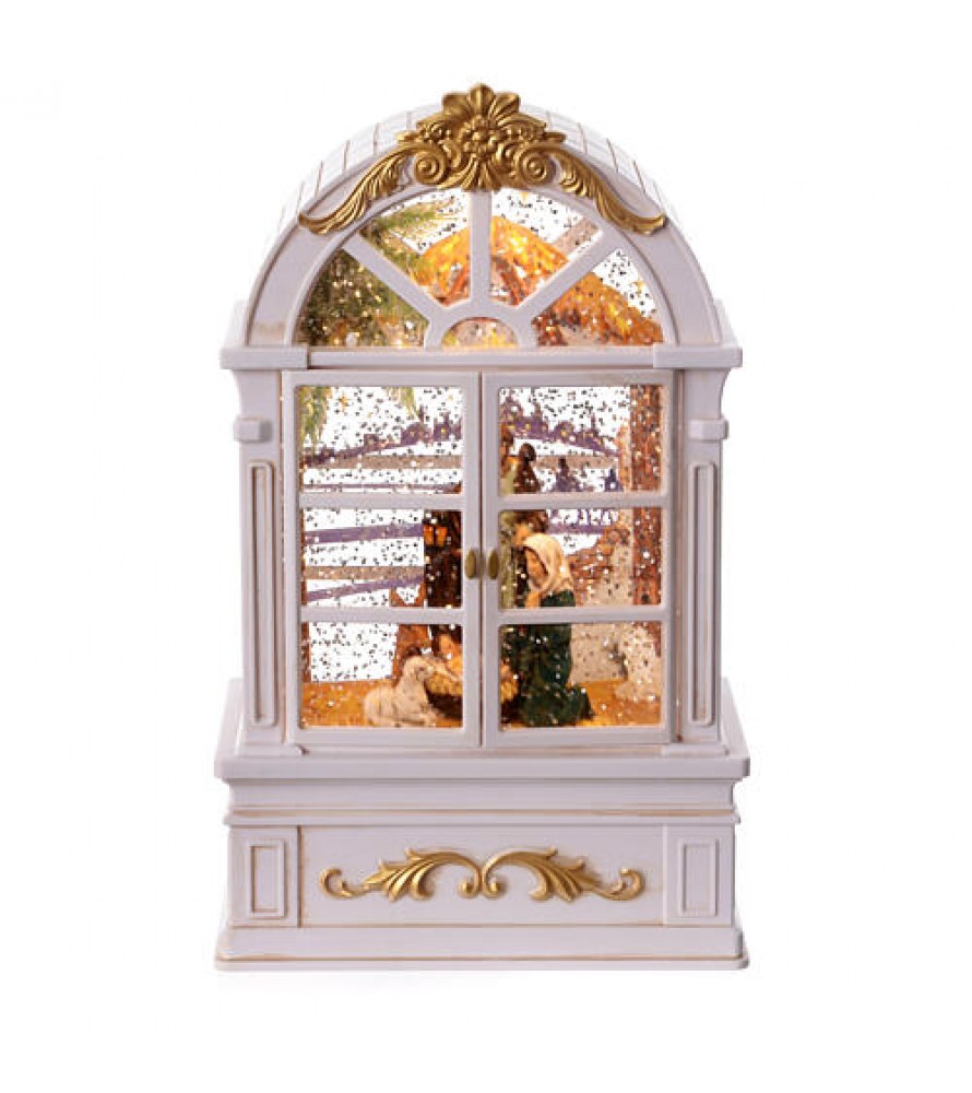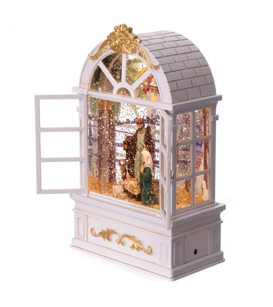 Bellissima ed elegante Finestra lanterna con luce led e acqua con glitter in movimento automatico effetto neve,realizzata in poliresina. All'interno la Sacra Famiglia è illuminata da una luce calda e avvolgente.