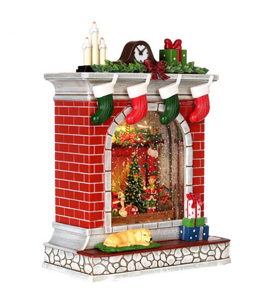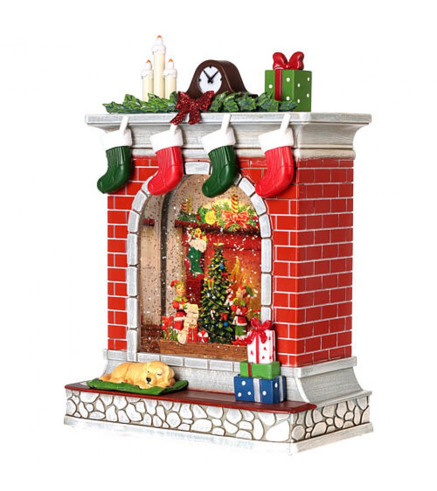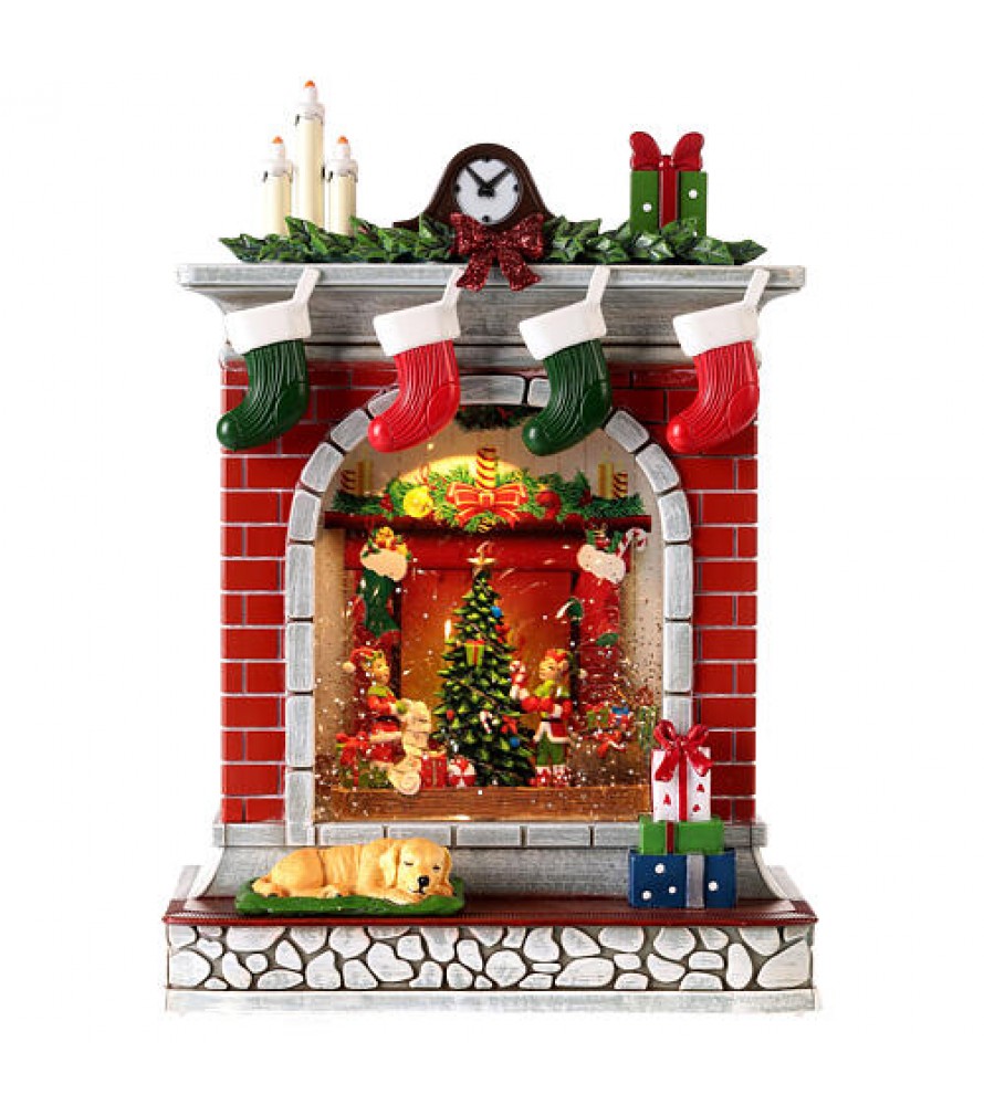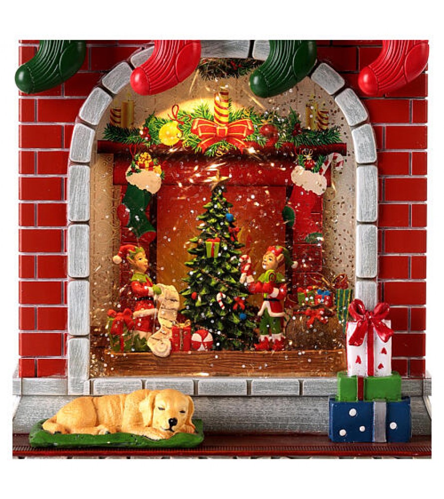 Bellissimo Camino ricco di dettagli, con luce led e acqua glitter effetto neve in movimento automatico,realizzato in poliresina. All'interno gli elfi di Babbo Natale stanno sistemando i doni intorno all'albero.