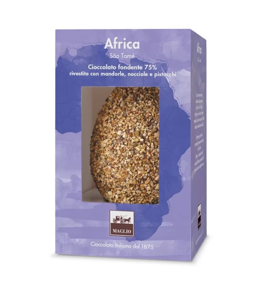 Dal 1875, la famiglia Maglio tramanda nel Salento l'arte del cioccolato di alta qualità. Il cacao utilizzato per l'uovo Africa proviene da coltivazioni sostenibili di São Tomé: un cioccolato amaro, forte e persistente, con leggere note di frutti rossi e un aroma inconfondibile di tostato. Maglio rappresenta oggi il perfetto equilibrio tra il rispetto della tradizione secolare e la ricerca dell'innovazione, garantendo un prodotto genuino e sorprendente.